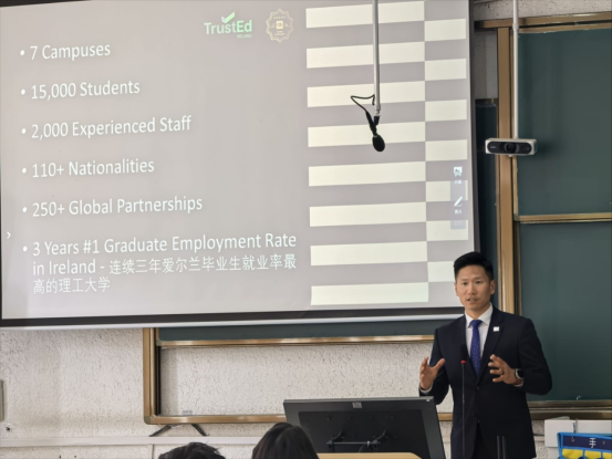 随后,孟晶围绕香农理工大学的办学实力、土木工程专业优势、“3+1”双学位项目培养方案、课程体系设置、出国资助政策、爱尔兰留学与生活等核心内容进行了详细宣讲。他结合往届学生案例,重点解读了项目在海外升学、职业资格认证、实习就业等方面的突出优势,系统梳理了申请流程、学分转换、签证办理等同学们关注的关键事项,为大家规划留学路径提供了清晰指引。