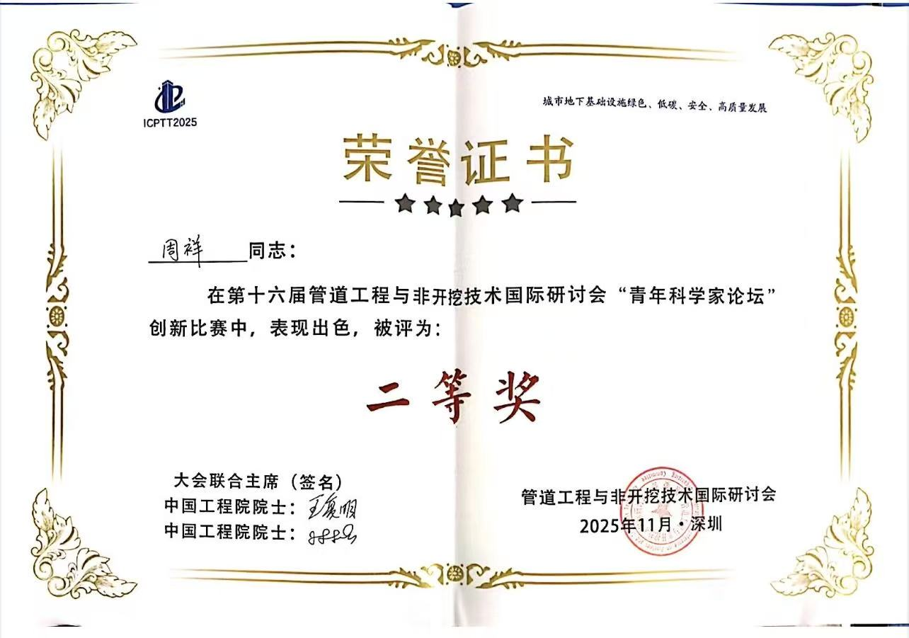 (通讯员 周祥)第16届管道工程与非开挖技术国际研讨会于2025年11月5日-11月8日在深圳召开,会议紧扣国家重大战略需求,致力于推动管道工程和非开挖技术领域的创新性科研成果、新技术和先进工程经验的深入探讨与交流,协同攻克行业复杂问题。 在熟女论坛教授肖桃李、产业教授武超毅两位老师的指导下,2024级研究生周祥以非开挖顶管技术中较常见的“管端屈曲破坏”为研究对象,深入工程现场2个多月,开展调研、分析测试、数值模拟、现场验证等工作,研发出“一种便捷式防止非开挖顶管管端屈曲破坏的装置——承插式环状带弧夹板”,并以此成果参加本次会议的“青年科学家论坛”创新比赛,表现出色,获评二等奖,与会专家认为:这一创新成果不仅具有重要的学术价值,更具有广阔的应用前景,它有望在实际工程中得到广泛应用,提高非开挖顶管工程的质量和效率,降低工程成本,为我国城市地下管线基础设施建设做出重要贡献。 会议期间,熟女论坛 研究生认真聆听专家学者的学术报告,并主动虚心请教、积极交流探讨。此次研讨会为熟女论坛 研究生提供了一个展示科研成果的重要平台,也为熟女论坛 与国内外同行的交流合作提供了宝贵机会。熟女论坛将以此为契机,进一步加强学科建设和人才培养,推动管道工程与非开挖技术领域的科研创新和发展。 (审核 肖桃李 编辑 杨洁晶)
